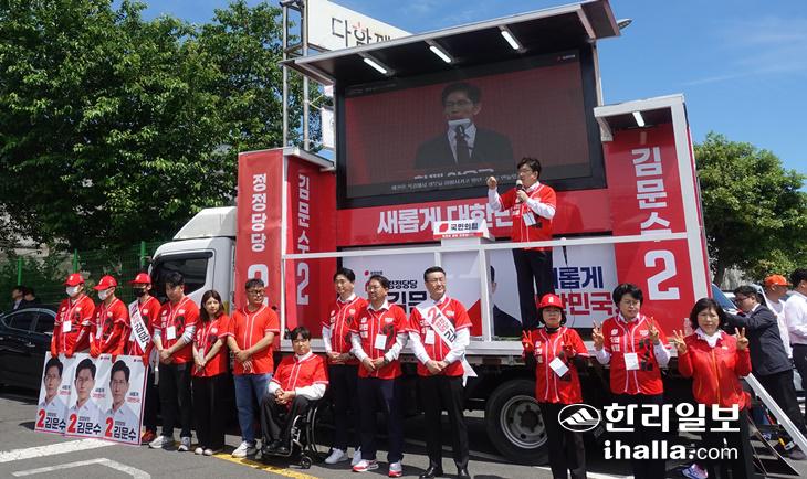 국민의힘 공동선대위원장을 맡은 권성동 원내대표가 17일 오후 제주시민속오일시장에서 김문수 후보 지지를 호소하고 있다. 진선희기자