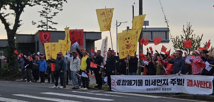 제주시 애월읍 광령리 종합폐기물 처리시설 반대대책위원회는 17일 오후 마을 안에서 추진되는 종합폐기물 처리시설의 사업 중단을 촉구하는 궐기대회를 열었다. 문미숙기자