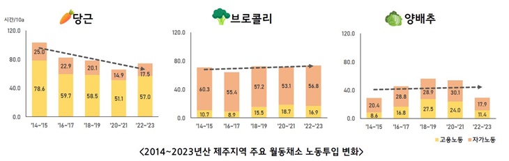 도 농업기술원은 매년 도내 30개 작물을 대상으로 경영비, 노동 투입량, 소득 등을 살피는 '농산물 소득조사'를 벌이고 있다. 도 농기원 농업디지털센터는 최근 10년간(2014~2023) 월동채소 소득 조사 분석 데이터를 기반으로 작목별 노동 시간 변화 추이와 농작업 투입 구조의 변화를 파악했다.