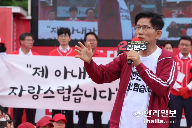 김문수 국민의힘 대선 후보가 2일 제주시 동문재래시장 탐라문화광장에서 열린 유세에서 지지를 호소하고 있다. 제주도사진기자회