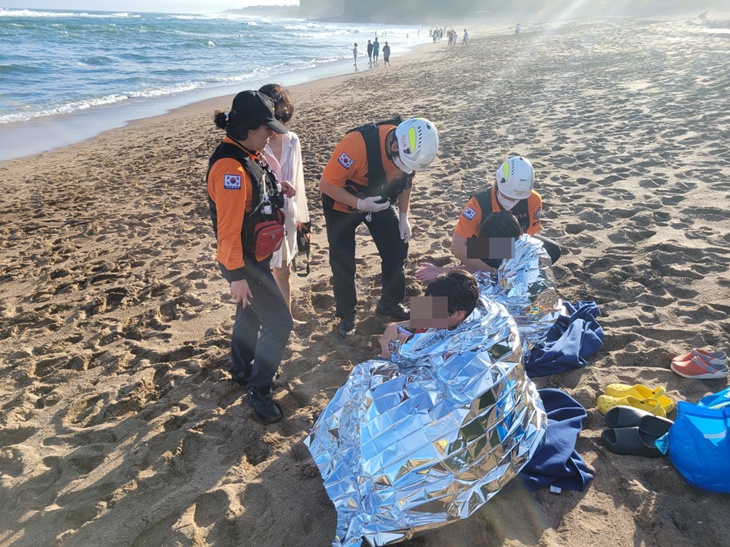 14일 중문해수욕장에서 구조된 미국인 10대 2명이 소방대원들의 처치를 받고 있다. 제주도소방안전본부 제공