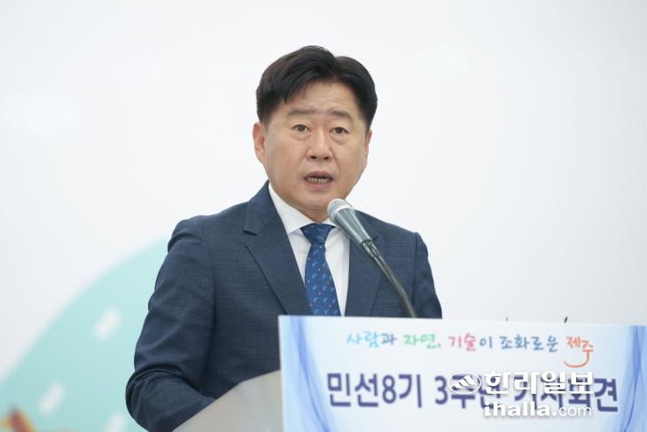 오영훈 제주특별자치도지사가 1일 제주도청 대강당에서 취임 3주년에 따른 기자회견을 하고 있다. 강희만 기자