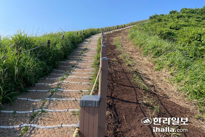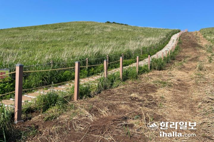 2일 오전 제주시 애월읍 봉성리 새별오름의 탐방로 인근 풀이 일부 제거되면서 훼손된 모습이다.