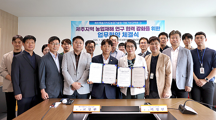 [한라일보] 제주도 농업기술원(원장 고상환)과 서귀포에 이전한 국립기상과학원(원장 박영연)은 30일 오전 농업기술원에서 '제주지역 농업 재해 관측 및 예보 고도화'를 위한 업무 협약을 체결했다.