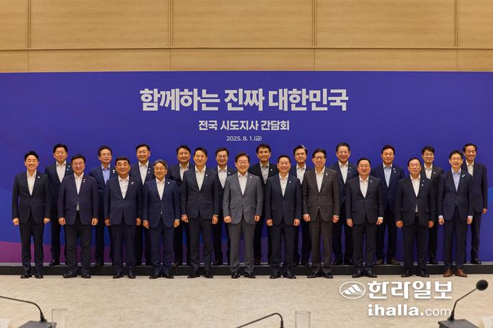 이재명 대통령이 1일 서울 용산 대통령실 청사에서 전국 시도지사 간담회를 마치며 기념촬영을 하고 있다. 앞줄 왼쪽부터 강훈식 대통령비서실장, 윤호중 행정안전부 장관, 김두겸 울산시장, 강기정 광주시장, 오세훈 서울시장, 이 대통령, 대한민국시도지사협의회장 유정복 인천시장, 박형준 부산시장, 이장우 대전시장, 최민호 세종시장, 김경수 대통령 직속 지방시대위원장. 뒷줄 왼쪽부터 오영훈 제주도지사, 이철우 경북도지사, 김관영 전북도지사, 김영환 충북도지사, 김동연 경기도지사, 김진태 강원도지사, 김태흠 충남도지사, 김영록 전남도지사, 박완수 경남도지사, 김정기 대구시장 권한대행, 우상호 대통령실 정무수석. 연합뉴스