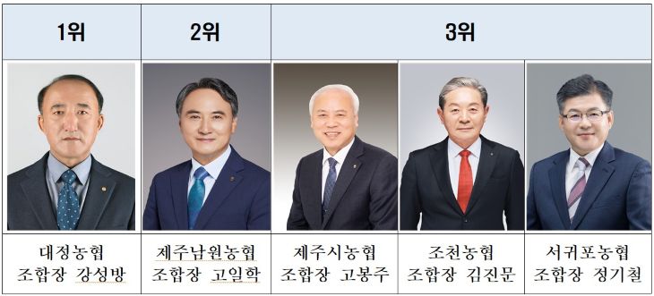 3일 농협중앙회 제주본부에 따르면 이번 평가에서 대정농협(조합장 강성방)이 1위, 제주남원농협 (조합장 고일학)은 2위, 제주시농협(조합장 고봉주)·조천농협 (조합장 김진문)·서귀포농협(조합장 정기철)은 3위에 각각 올랐다.