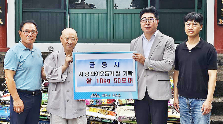 [한라일보] 한국불교태고종 금붕사(주지 성빈스님)는 지난 4일 150만원 상당의 쌀을 제주시 구좌읍사무소(읍장 안석봉)에 기탁했다. 기탁받은 쌀은 지역 내 저소득 장애인 가구와 기초생활수급자 가구에 전달할 예정이다.