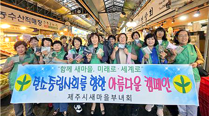 제주시새마을부녀회(회장 강길선)는 지난 11일 제주시 동문시장에서 읍면동새마을부녀회장 등 20여 명이 모인 가운데 탄소중립 캠페인 활동을 전개했다.
