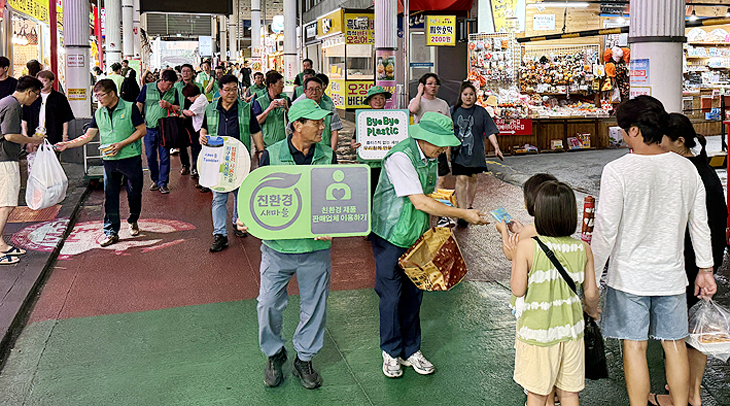새마을지도자서귀포시협의회(회장 박두홍)는 지난 11일 서귀포 매일올레시장에서 2035 탄소중립 목표 달성 및 2040 플라스틱 제로섬 만들기 캠페인을 전개했다.