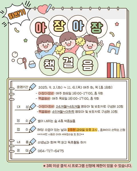 [한라일보] 제주도서관은 내달 2일부터 오는 11월 6일까지 2025년 하반기 아장아장 책걸음을 운영한다.