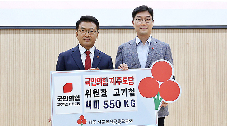 국민의힘 제주도당(위원장 고기철)은 지난 20일 제주시 혼디누림터에서 사랑의 쌀 550kg를 제주사회복지공동모금회(회장 강지언)에 기탁했다.