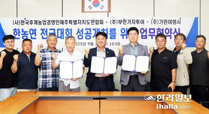사단법인 한국후계농업경영인제주특별자치도연합회(회장 문병철)는 2일 한농연제주도연합회 사무국에서 (주)부민가자투어(대표 부창우)·(주)기린여행사(대표 강재욱)와 '제20회 한국후계농업경영인 전국대회' 성공 개최를 위한 업무협약을 맺었다.