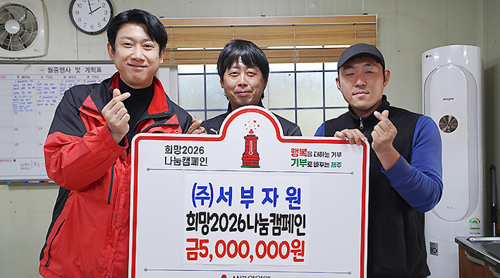 (주)서부자원(대표 양영순)은 지난 10일 희망2026나눔캠페인 성금 500만원을 제주사회복지공동모금회(회장 강지언)에 기탁했다. 성금은 청년 대학준비금 및 기초수급자 지원, 지역 내 취약계층 지원 등에 사용된다.