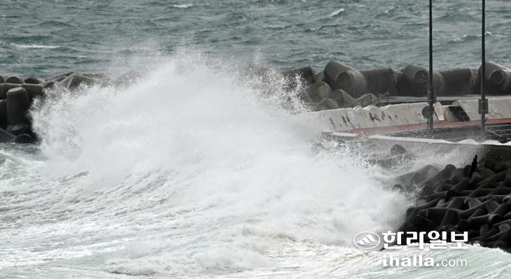 [한라일보] 제주도 전 해상에 풍랑주의보가 발효된 14일 제주시 탑동 방파제에 거대한 파도가 밀려오면서 도로를 위협하고 있다. 강희만기자