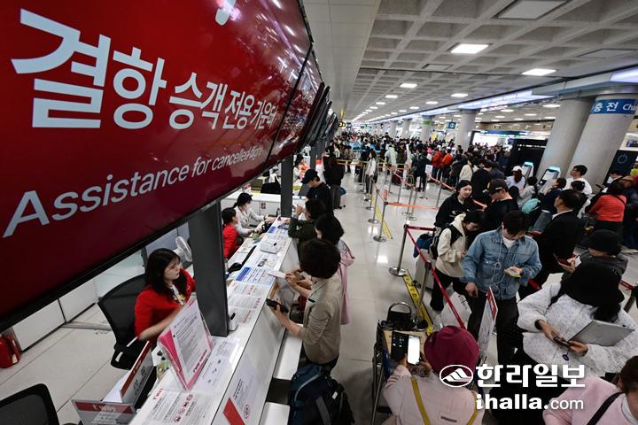 이에 이날 제주공항에는 체류객 지원 '주의' 단계가 내려졌다. 제주 출발 항공편 기준 결항편 승객이 3000명 이상일 때 '주의' 단계가 발효된다.