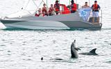 [한라일보] 12일 서귀포시 대정읍 영락리 앞바다에서 돌고래들이 놀이하는 모습을 탐방객들이 신기한듯 지켜보고 있다. 이상국기자 |