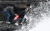 [한라일보] 지난 6일 서귀포시 안덕면 사계리 해안을 찾은 관광객들이 갑작스럽게 밀려온 높은 파도에 놀라 넘어지고 있다. 강희만기자