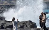 [한라일보] 13일 제주시 애월읍 구엄리돌염전을 찾은 관광객들이 높은 파도를 배경으로 기념사진을 찍고 있다. 이상국기자 |