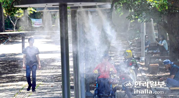 5일 제주시 신산공원에 설치된 안개분수에 폭염에 지친 시민들이 찾아와 무더위를 식히고 있다. 강희만기자