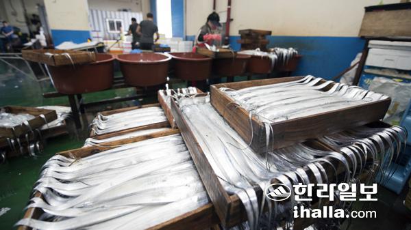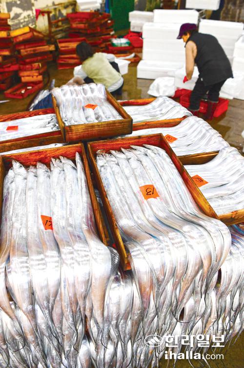 [한라일보] 1일 제주시수협 어판장에서 어민들이 지난 밤사이 낚시로 잡아 올린 싱싱한 갈치를 선별하는 작업을 하고 있다. 최근 잦은 기상악화 등으로 조업일수가 줄면서 갈치 어획량은 줄면서 가격도 소폭 상승하고 있는 것으로 집계되고 있다.