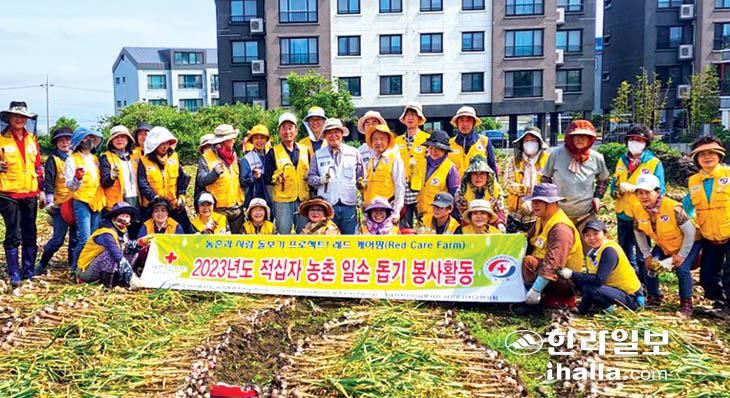 대한적십자사봉사회제주시지구협의회(회장 양진석)는 지난 21일 적십자봉사원 40여명이 참여한 가운데 제주시 애월읍 하귀리의 농가를 방문해 농촌 마늘 수확 일손돕기 봉사활동을 실시했다.