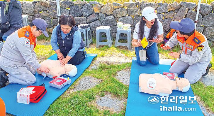 제주동부소방서 성산여성의용소방대(대장 홍재영)는 지난 20일 광치기 해변공연장에서 열린 '꿈의 공간을 펼치다' 행사에 참가한 주민, 어린이 등을 대상으로 심폐소생술과 안전교육을 실시했다.