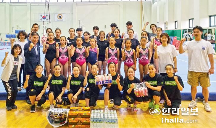 제주특별자치도체조협회(회장 강창용)는 지난 7일 제주특별자치도체육회관 3층 체조연습장을 방문해 교류합동훈련 중인 일본 미에현 상호체조클럽 여자 고등부선수들에게 제주감귤과 삼다수를 전달하고 격려했다.