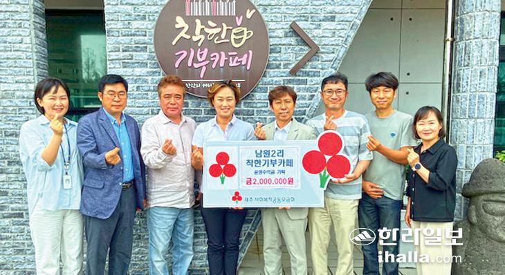 서귀포시 남원2리마을회(이장 오성진)는 지난 17일 남원2리착한기부카페 운영수익금 200만원을 남원읍지역사회보장협의체(공동위원장 현은정, 김기창)에 기탁했다. 이 카페는 남원2리마을회에서 리사무소 내 유휴공간을 활용해 만든 무인카페이며, 이를 통한 판매수익금은 이웃돕기 성금으로 기탁하고 있다.
