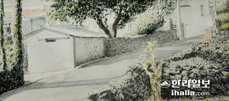 ![]() 화산섬 주상절리 그 대표적인 해안절경 마을 [한라일보] 관광산업에 활력을 불어넣기 위하여 관광단지를 조성하는 과정에서 중문 해안으로 입지 선정을 하게 된 것은 세계 어디에 내놔도 손색이 없는 해안 절경이 중요한 배경으로 작용했다고 한다. 중문동 해안과 이어지는 주상절리대는 천연기념물 제443호이면서 제주섬이 지질공원으로 인정받게 하는 중요한 요소다. 육지가 바다를 향해 돌출한 곳은 제주어로 '코지'라고 한다. 반대로, 코지와 코지에 의해서 에워싸인 곳을 '개'라고 한다. 마을 해안을 따라서 걸어가다 보면 그 코지와 개가 오밀조밀한 멜로디를 연주하듯 시각적인 풍요를 선물하고 있다. 마을 바닷가는 해식애(海蝕崖)가 발달한 지형이기에 '선궷네깍' 부근과 '제베낭궤' 등 곳곳에 주상절리 해안의 면모를 볼 수 있다. '베튼개' '큰여또' 일대에 잘 나타나 있는 파식대(波蝕臺) 형태는 파도의 침식에 의하여 상대적으로 평탄한 해안 경관을 보여주고 있다. ![]() 하천은 주거지역을 대포천과 거린사슴과 갯거리오름 일대에서 발원한 회수천과 동회수천이 주변 마을과 경계를 이루며 건천의 모습으로 내려오다가 약천사 인근에서 만나 '선궷내'가 돼 바다로 나간다. 옛날에는 선궷내의 풍부한 수자원을 이용하여 쌀농사를 지을 수 있었던 지역. 계단식 논을 만들어 섬 제주에서는 귀한 쌀을 얻을 수 있었다는 것이다. 지금은 집들과 과수원, 비닐하우스들이 들어서 있어서 옛 모습들이 많이 바뀌었지만 조상 대대로 대포마을이 얼마나 아름다운 풍광을 보유하고 있었는지, 그 자긍심을 보여주는 대포십경(大浦十景)이다. 사단고송(社壇孤松) 송전신지(松田新池) 남산관해(南山觀海) 암지명월(暗旨明月) 하봉목마(下峯牧馬) 남포귀범(南浦歸帆) 보성낙조(堡城落照) 선천관어(先川觀漁) 동회유천(東廻流泉) 사지구허(寺旨舊墟) 이상 열 개다. 마을 자체가 명승지라고 하는 주관이 뚜렷하게 느껴진다. 올레꾼들이 대포연대 위에 올라가 바라보며 내지르는 탄성은 그냥 생기는 것이 아니리라. 대포마을 임영찬 회장에게 마을공동체가 보유한 자긍심에 대하여 묻자 이렇게 대답하였다. "중문관광단지와 인접하여 40년 넘는 기간을 보내면서 주민들이 관광산업과 연계된 의식이 성장했다는 것입니다. 미래지향적으로 보존과 발전을 확보할 수 있는 경쟁력 있는 마을이라는 자신감이라고 생각합니다." 반농반어의 생활환경을 조상 대대로 이어 내려오다가 중문관광단지라고 하는 거대한 변화의 곁에서 겪은 다양한 경험들이 지금은 하나의 자신감으로 승화되어 후손들에게 물려줄 대포마을의 위상을 만들어 가고 있다는 것이다. 거대한 가능성이 관광산업과 연계하여 펼쳐질 미래에 대한 대포마을 주민들의 자신감. 주변 여건이라고 하는 것이 무시할 수 없는 변수로 작용하는 환경에서 마을공동체의 정체성을 기반으로 하는 업그레이드 된 상황을 창조하고자 노력하고 있다. <시각예술가> 완만한 오르막길에서 <수채화 79cm×35cm> ![]() 풍경을 그리는 방법이야 재료에 따라서 기법에 따라서 다양성을 추구할 수 있지만 얻고자 하는 느낌을 위하여 선택을 한다면 여기서는 이 방법을 취하는 것이 최선이라고 생각하였다. 온화한 느낌의 광선과 오랜 기간을 길과 밭, 길과 집 사이에서 자신의 역할을 묵묵하게 수행해 온 저 돌담들의 노고를 그렸다. 두텁고 진한 방식이 아니더라도 스며든 듯 화면 속으로 들어간 느낌을 얻기 위하여 은은한 담채 또한 풍경을 표현하는 멋스러움이라 해야 할 것이다. 낮은 경사를 따라서 길가에 펼쳐진 그림자들이 함께 올라간다. 근경에서의 돌담과 중경에서의 돌담은 거리에서뿐만이 아니라 전체적인 느낌이 다르다. 마치 전체와 부분을 놓여진 위치에서 설명하는 기분이라고나 할까. 집 안에 심어진 오래된 나무가 옹골찬 기백을 발산하고 있다. 점점 높은 집들이 들어서는 시대에 그래도 예스러운 정한을 뿜어내는 고마움에 대하여 생각할 기회를 얻었다. 사람이 사는 공간에 대한 정겨움을 너무도 평범한 오르막길을 그리며 새롭게 발견하는 것이다. 분명한 것은 저 길을 따라 오랜 세월 마을 사람들의 정이 오갔을 것이다. 큰개포구 서쪽 데시배기 <수채화 79㎝×35㎝> ![]() 특히 그림에 등장하는 것 같이 자갈과 모래가 섞여 있는 곳은 목선을 끌어 올려서 수리하거나, 새롭게 건조하여 바다에 진수하기 좋은 작업 여건을 제공한다. 그리는 동안에 끊임없이 상상하였다. 저 곳에 중국을 다니는 수송선이 수리를 위하여 올라가 작업하는 모습. 재현하면 놀라운 관광자원이 될 것이라는 역사성과 함께. 지금은 대포항 안쪽이 준설되어 깊어졌지만 옛날엔 자갈과 모래가 알맞게 배합된 그런 포구였다. 지금의 기준이 아니라 천 년 전 해양문화 기준으로 얼마나 귀중한 자연 여건을 보유하였던 곳인지 되새김 하듯 그렸다. <저작권자 © 한라일보 (http://www.ihalla.com) 무단전재 및 수집·재배포 금지 > |