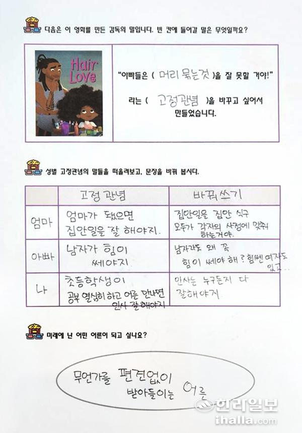 ![]() 메시지를 정확하게 이해하고 공감할 수 있는 능력 새로운 지식과 관점 얻기 위한 정리·고민 활동도 [한라일보] 영화 리터러시란 영화인이 제작할 때 전달하고자 한 내용을 정확하게 이해하고 공감할 수 있는 능력에 따른 역량이라고 볼 수 있다. 현재 영화 리터러시 교육은 크게 보급되어 진행되고 있지는 않지만, 학교 정규 교육과정에서의 이해를 돕기위해 영화의 일부분을 활용해 학습자의 이해를 높이거나, 영화를 직접 배우는 이들에게 영화에 대한 전반적인 이해를 증진시키려는 목적으로 활용되고 있음을 알 수 있다. ![]() 그러나 영화를 보는 것만으로 새로운 지식이나 세계관을 형성하기는 어렵다. 영화를 보면서 자신의 생각을 정리하고 고민하는 활동이 이어져야만 새로운 지식이나 다양한 관점을 갖게 될 것이다. 예를 들어 내가 본 영화가 어떤 내용인지, 주인공들은 어떤 성격인지, 감독은 어떤 의도에서 이 영화를 만들었는지, 내가 주인공이라면 어떻게 할 것인지 등 다양한 질문을 자신에게 던지고 스스로 대답을 하면서 자신의 사고를 확장해야 한다. 그리고 스스로와 대화하는 것 외에 타인과 함께 영화에 대해 이해한 것을 나누고, 서로 이해한 내용이 공감되는지 아니면 관점의 차이로 대립되는지를 확인하는 작업이 자연스럽게 이루어지면서 결국 이 모든 것은 자신의 삶과 연결하여 해석하고 평가될 수 있어야 한다. ![]() ![]() 영화 리터러시 교육은 학습자가 영화 내용을 이해하고 해석함에 따라 인지적, 정서적, 표현적 측면에서 공감하는 능력을 기를 수 있고 이를 통해 결국 소통에 이르게 할 수 있다. 학생들은 감상문을 기술하면서 등장인물의 인지적, 정서적 상태를 파악하고 영화 스토리 이해에 필요한 사회생태학적인 요인들을 찾을 수 있으며, 그 결과 영화 제작의 의도를 파악하고 공감할 수 있다. 등장인물을 분석해 정서적인 측면을 해석할 수 있는데, 개인의 감정상태에 따라 조금씩 차이는 있을 수 있다. 또한 영상의 구도 및 배경 그리고 음악을 통해 물리적인 아름다움을 느낄 수 있고, 인간 및 비인간의 내적 아름다움도 알 수 있다. 또한 느낀 점을 서로 공유하면서 자신이 이해한 것을 타인도 생각하고 있는지 확인할 수 있고, 내가 느끼지 못한 부분을 이야기를 통해 알게 되었을 때 새로운 시각으로 영화 해석을 할 수 있다. 영화를 본 후 상상력과 추론력, 새로운 상황에 대한 몰입력 등을 기대할 수 있으며, 단순하게 영화를 보기만 했을 때보다 감상문을 쓰고 토론을 하면서 생각이 정교해질 수 있다. <채경진/미디어교육연구회 ‘ON’> 수업 이렇게 진행했어요 ▷수업 대상: 초등 고학년 ▷수업 준비물: 단편 애니매이션, 활동지, 필기도구 ▷수업 시간: 1차시 60분 1. 활동개요 -헤어 러브(Hair Love)는 매튜 A.체리(Matthew A.Cherry) 감독이 만든 단편 애니매이션이다. 전체 상영시간은 단 7분. 짧은 시간안에 아버지 스티븐과 그의 딸 주리의 관계를 그녀의 독특하고 아름다운 머리카락으로 빚어지는 에피소드로 보여준다. 아버지와 딸, 아픈 어머니의 서사가 자칫 정상가족의 아름다운 서사로 진부하게 보일 수도 있으나, 영화는 한 발 더 나아가 자아 정체감과 자존감, 자부심 등의 중요한 키워드들에 대해 질문을 남긴다. 주류 애니메이션에서의 더 나은 표현과 다양성에 대한 열망으로 미디어에서 자연스러운 검은 머리카락이 표현되지 않는다는 것을 인식한 감독은 유색인종 젊은 남성과 여성에게 영감을 주고 힘을 실어줄 수 있는 이야기를 만들고 싶었다고 한다. 또한 정상가족에서 시사하는 가족의 성역할을 전복하고, '자연스러운' 모발을 포용하고 연대하는 것이 무엇인지 고찰해 볼 수도 있다. 2. 활동목표 -다양하고 독특한 각자의 스타일을 포용해 수용과 공감 및 표현의 힘에 대해 알 수 있다. -가족 내 성별 고정관념에 대해 생각해 볼 수 있다. 3. 활동내용 -준비활동(10분) : 가족들이 나를 위해서 특별히 애쓰고 있다고 느끼는 활동이 있나요? : 나만의 독특한 방식이나 행동, 모습들이 있다면 무엇인가요? : 영화 표지보고 이야기를 상상해 봅시다. -본활동(40분) : 애니매이션 시청하기 : 등장인물들과의 관계 추론하기 : 주인공의 신체적인 특징과 만화적인 상상이 돋보이는 장면 골라보기 : 고정관념의 키워드 골라보고, 문장 완성하기 : 가족 내 성 고정관념 바꿔보기 -마무리(10분) : 미래에 난 어떤 모습이 어른이 되고 싶나요? : 발표하고 소감 나누기 ■기사제보 ▷카카오톡 : '한라일보' 또는 '한라일보 뉴스'를 검색해 채널 추가 ▷전화 : 064-750-2200 ▷문자 : 010-3337-2531 ▷이메일 : hl@ihalla.com ▶한라일보 유튜브 구독 바로가기 <저작권자 © 한라일보 (http://www.ihalla.com) 무단전재 및 수집·재배포 금지 > |