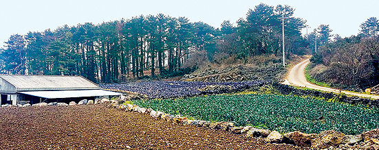 나지막한 천아오름 주변 아름다운 농로를 따라 걸었다. 밭이라고 하지만 돌담 언저리에 대나무들이 집터였음을 보여주는 곳이 많다. 식용수나 가축급수에 이용했던 연못들이 있다. 4·3 이전까지만 해도 무려 14개 동네가 분산되어 있던 대촌락이었다.
